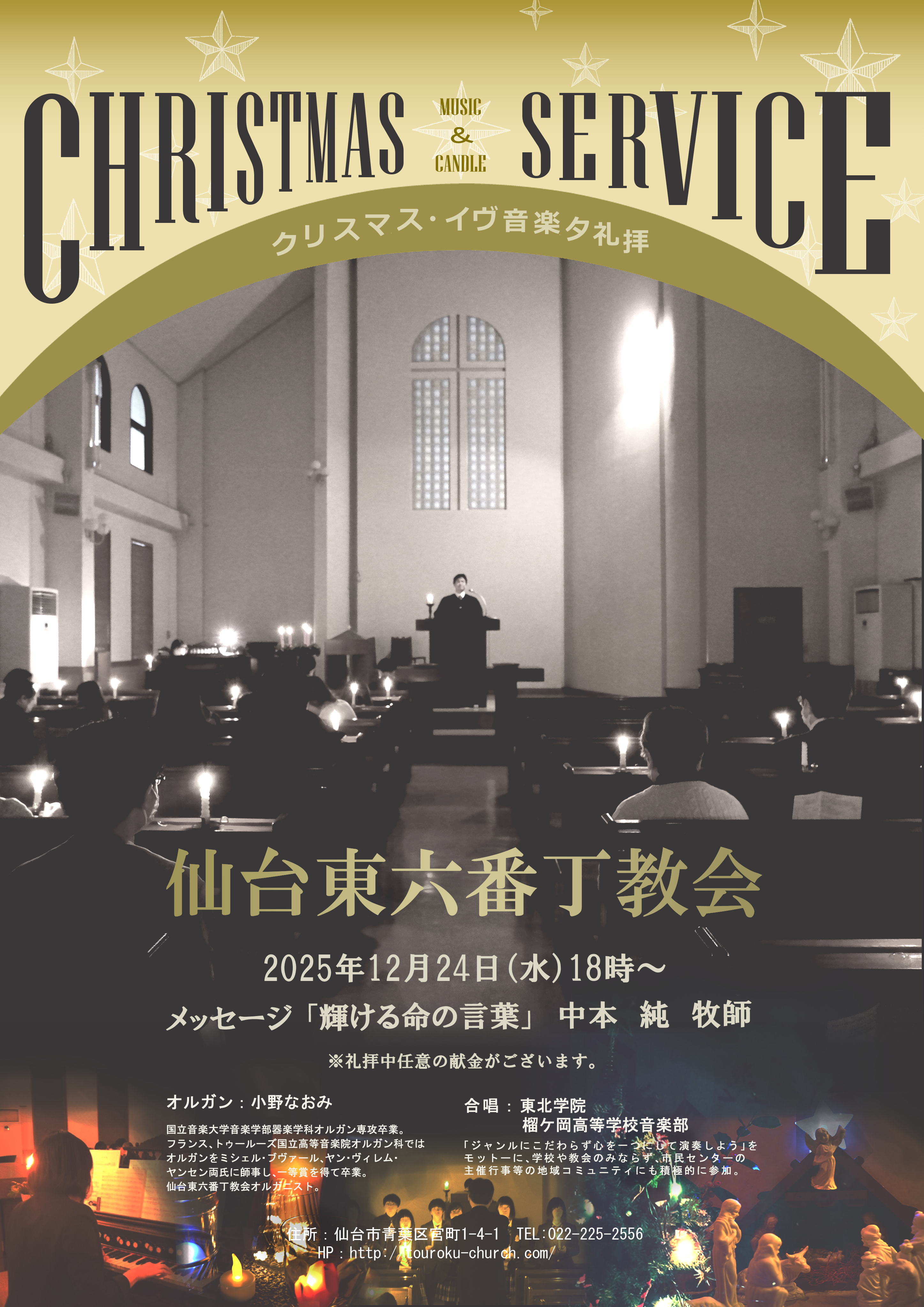 仙台東六番丁教会では今年も12月24日(水)午後6時00分より「クリスマスイヴ音楽夕礼拝」を行います。音楽礼拝の中でオルガニストの小野なおみさんによるオルガン演奏と、東北学院榴ケ岡高校音楽部生徒の方々による合唱が行われます。オルガンの音色と合唱に耳を澄ましながら、キャンドルサーヴィスの時をご一緒に過ごしませんか。お一人でも多くの方のご参加を心よりお待ちしています!